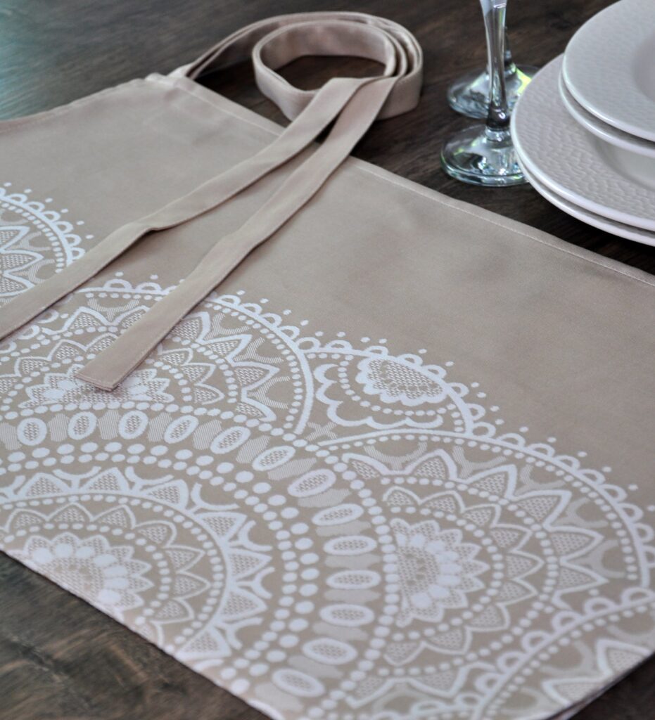Svilenkastog sjaja i posebnog načina izrade, pregače i kuhinjski ručnici s motivom konaovskog veza ili paške čipke unijet će radost mediteranske kulture i tradicije Vašem stolu.